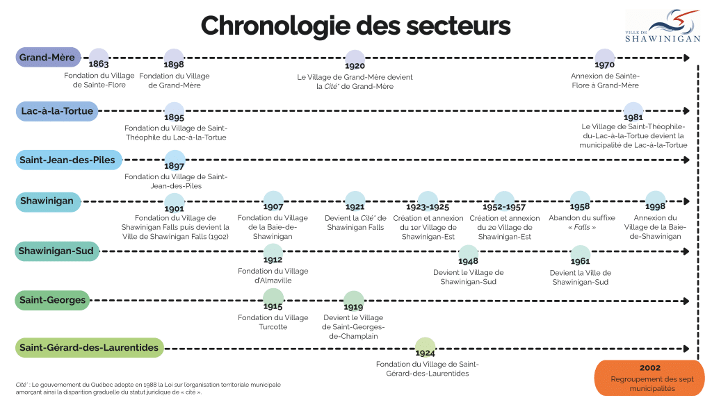 Le 1er janvier 2002, sept municipalités du territoire se regroupent : Lac-à-la-Tortue, Grand-Mère, Saint-Jean-des-Piles, Shawinigan, Shawinigan-Sud, Saint-Georges-de-Champlain et Saint-Gérard-des-Laurentides. Ensemble, elles forment la Ville de Shawinigan.